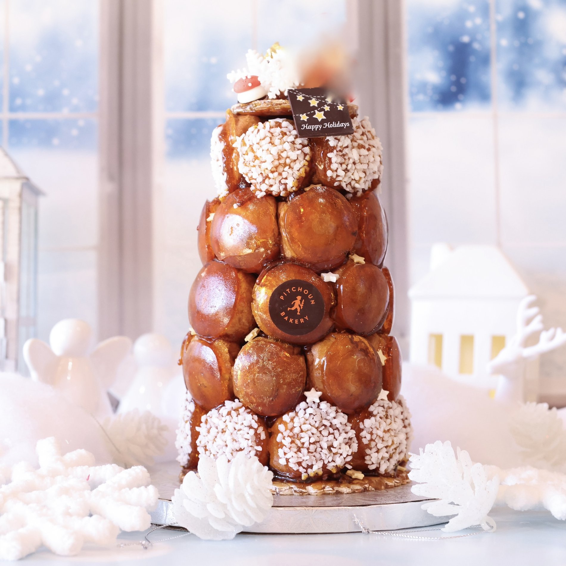 Delicious Croquembouche cake, beautifully New Year decorated for 12/31, with 30 little puffs, caramelized and filled with a vanilla pastry cream. Sugar & chocolate decors