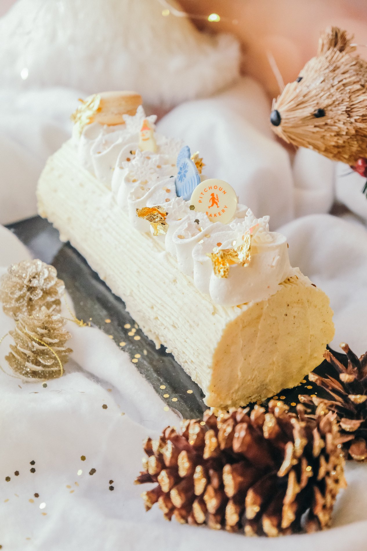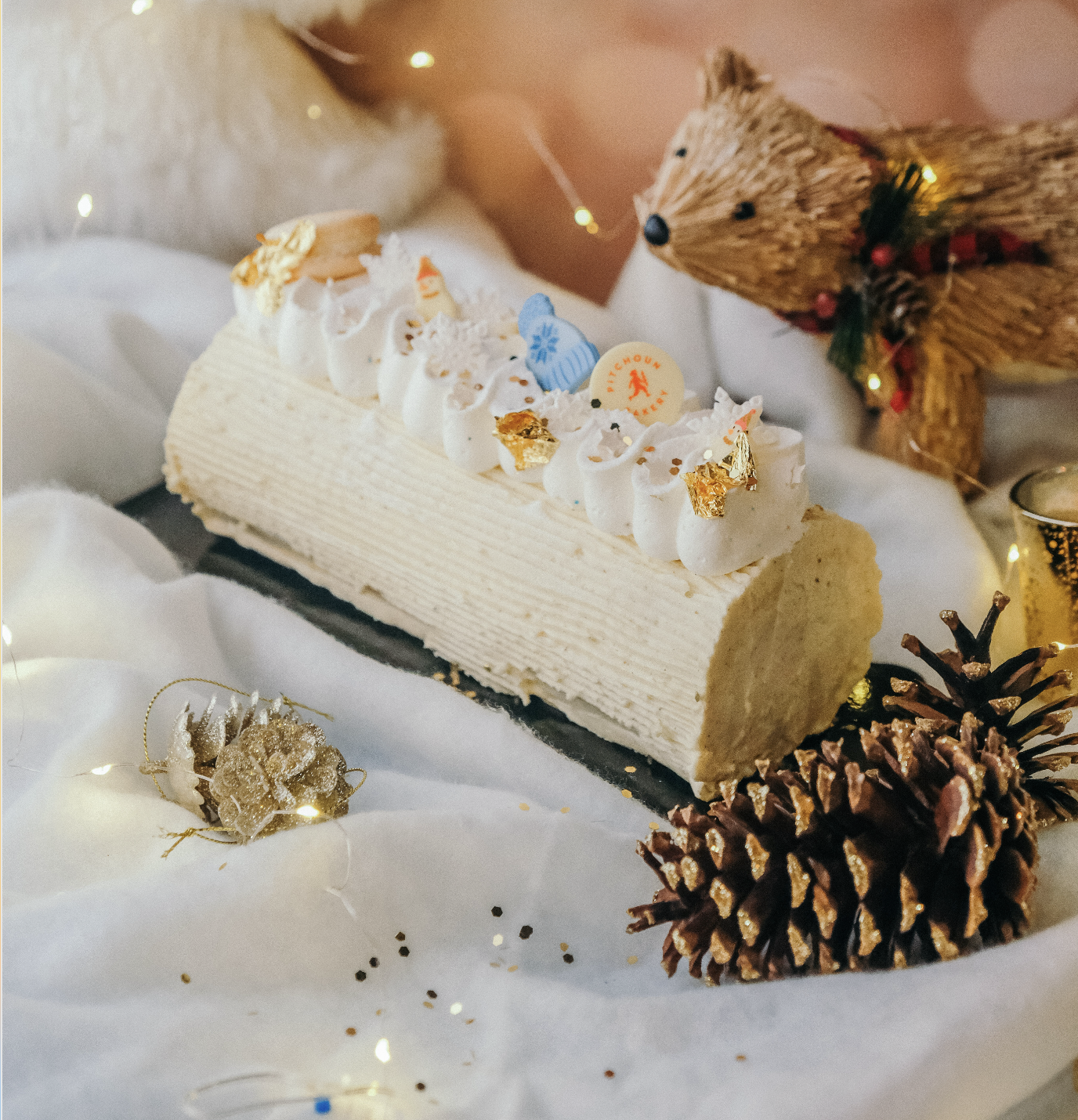 The traditional Holiday log dessert, is made with flavored butter cream and genoise sponge cake, and has the shape of a tree trunk. Decorated with winter/snowflake decors.