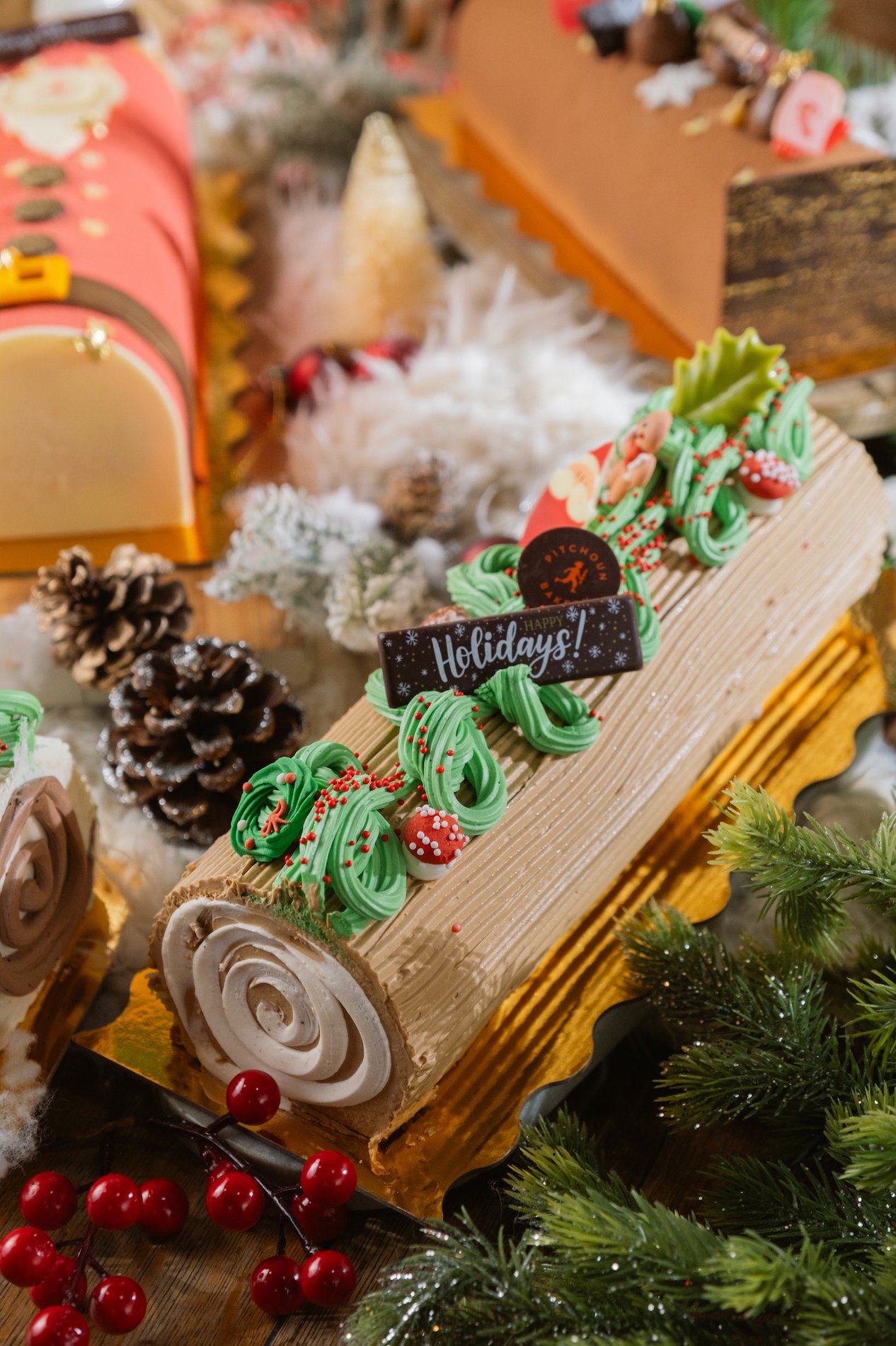 The traditional Holiday log dessert, is made with flavored butter cream and genoise sponge cake, and has the shape of a tree trunk. Decorated with holiday decors.
