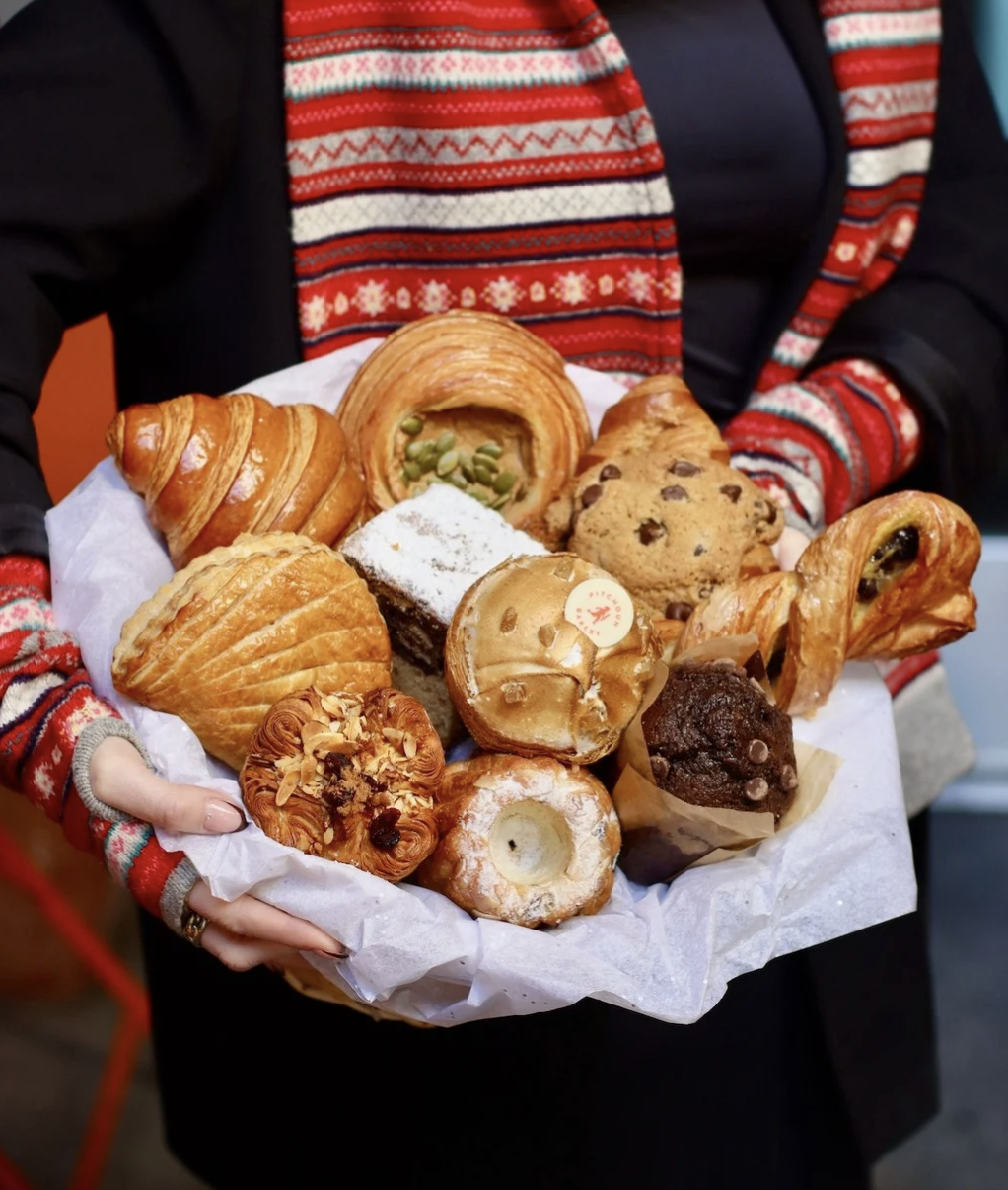 Includes 10 morning pastries: x1 butter croissant, x1 fall kouign amann (cranberry, maple syrup), x1 apple turnover, x1 pumpkin danish, x1 crookie, x1 chocolate twist, x1 coffee cake, x1 chocolate muffin, x1 Christmas tree croissant (gingerbread filling), x1 kouglof