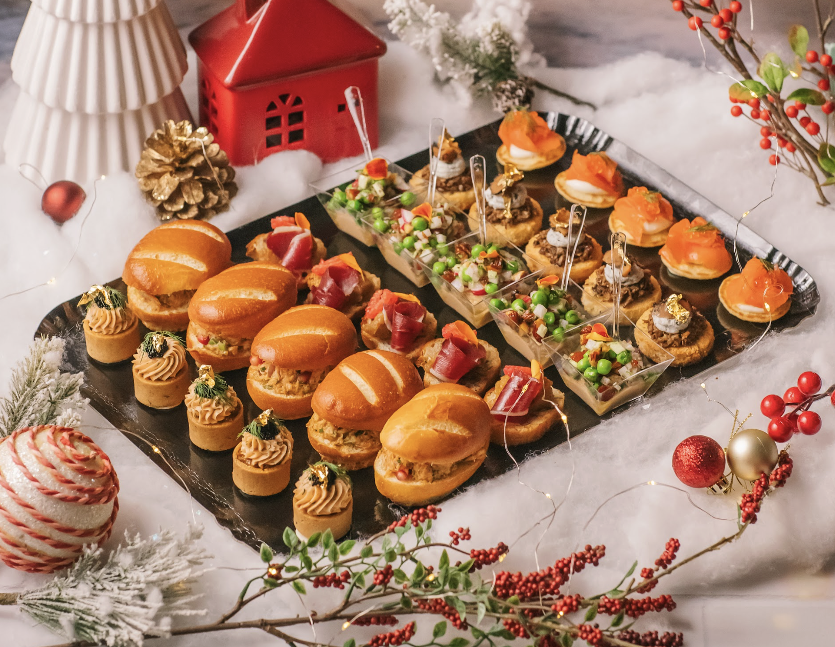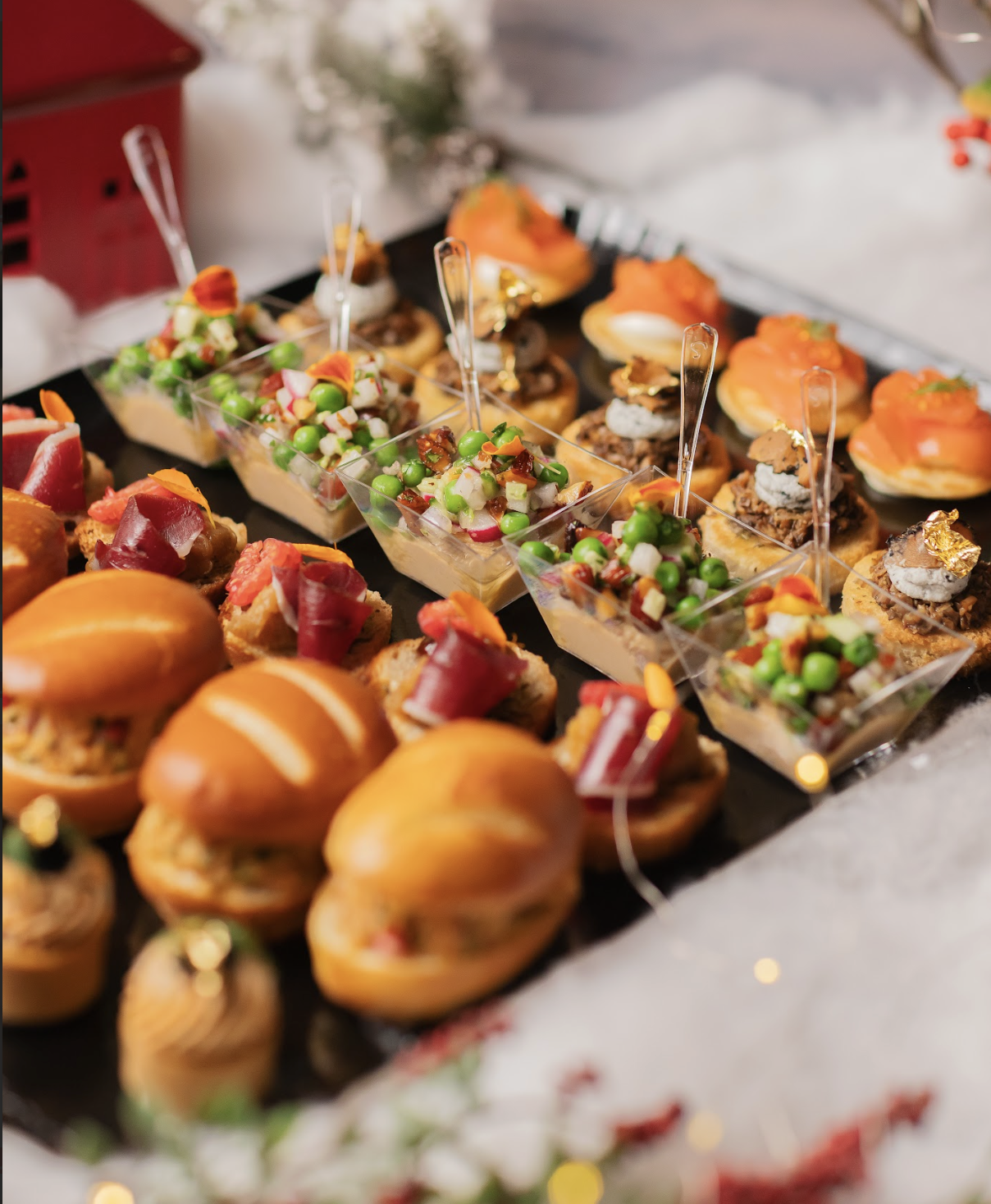 Crostinis (toasted baguettes), Blinis (small european pancakes), Navette sandwiches (brioche mini slider sandwich), Verrines (mini plastic jar containers).
