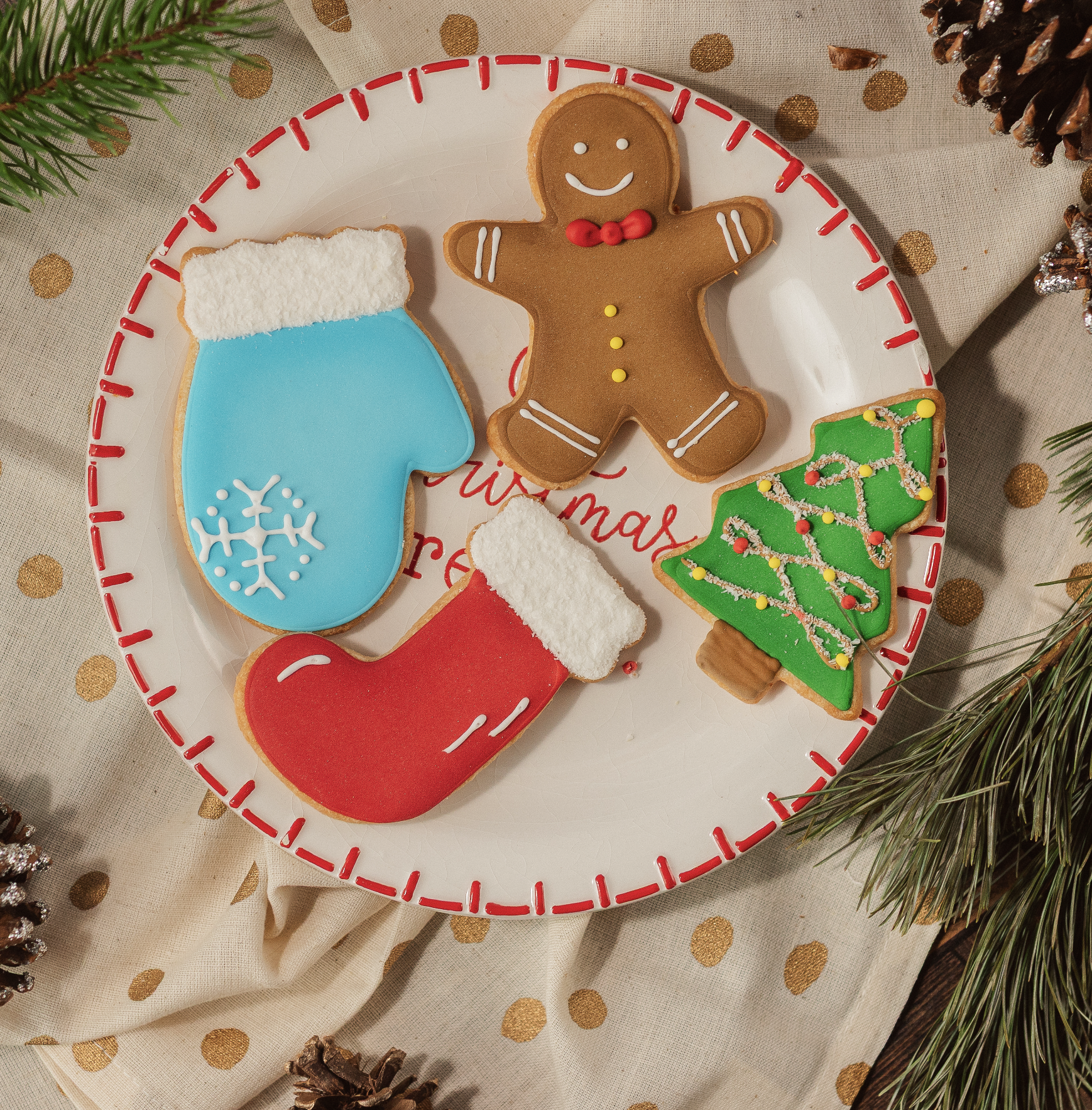Delicious and pretty decorated sugar cookies, Christmas themed. Random shapes and designs.